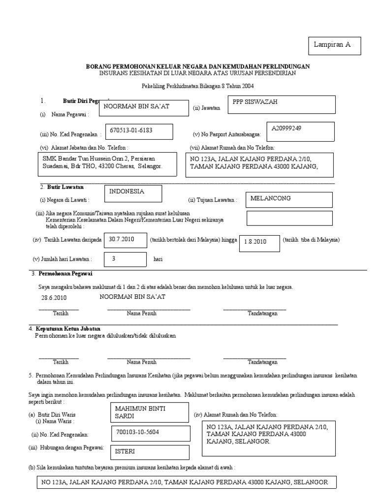 Lampiran A BORANG PERMOHONAN KE LUAR NEGARA DAN KEMUDAHAN PERLINDUNGAN INSURANS KESIHATAN DI LUAR NEGARA ATAS URUSAN PERSENDIRIAN Peliling Perkhidmatan Bilangan 8 Tahun 2004 1. Butir Diri Pegawai i ii Jawatan iii No. Semasa anda mengisi permohonan insurans nyawa anda anda mungkin berfikiran yang anda akan selamat sekiranya anda menipu.